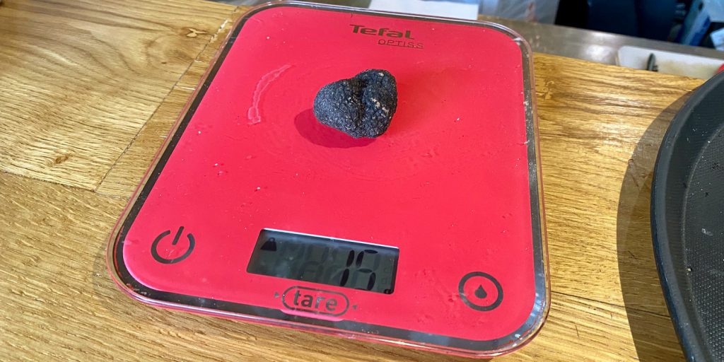 På Tartuf Shop kan man också köpa färsk tryffel över disk. Lite beroende på hur mycket de har just då eftersom de använder en hel del till maten. Jag köpte tre tryfflar på sammanlagt 59 gram och det kostade knappt 200 kr. Då ska man betänka att färsk tryffel i Sverige, svensk eller fransk, brukar ligga på ca 7 kr/gram. Så ungefär halva priset.